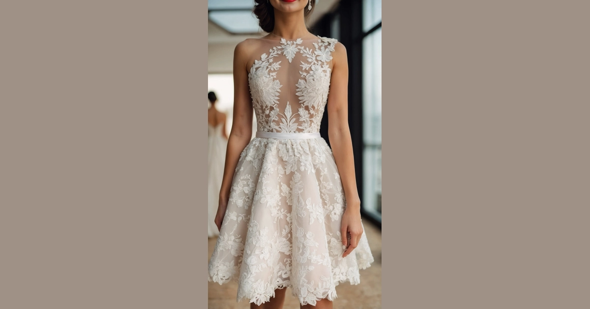Check out this stunner! Forget those giant, floor-sweeping dresses that make you feel like you’re carrying a whole duvet down the aisle. This gorgeous short wedding dress is practically begging you to hit the dance floor. With its super pretty lace details that almost float over the sheer top, you’ll look like a modern-day fairy tale princess who’s actually ready to party. It’s chic, it’s fun, and best of all, no one’s stepping on your train while you’re trying to grab another slice of cake!