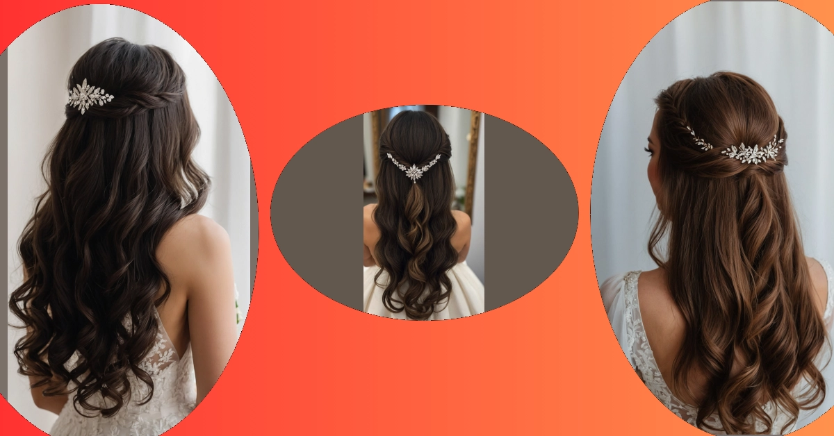 Okay, so maybe you’re picturing super sleek, straight hair for a wedding, like a shiny waterfall down her back. But check out this look! It’s rocking the best of both worlds – super elegant at the top, holding it all together with that blingy, star-flower-whatever-it-is hair clip that basically screams ‘I’m fabulous!’ It’s like, ‘Yeah, I’m sophisticated, but I also brought my sparkle game.’ Plus, a half-up style like this means fewer flyaways trying to photobomb your perfect wedding pics. Winning!