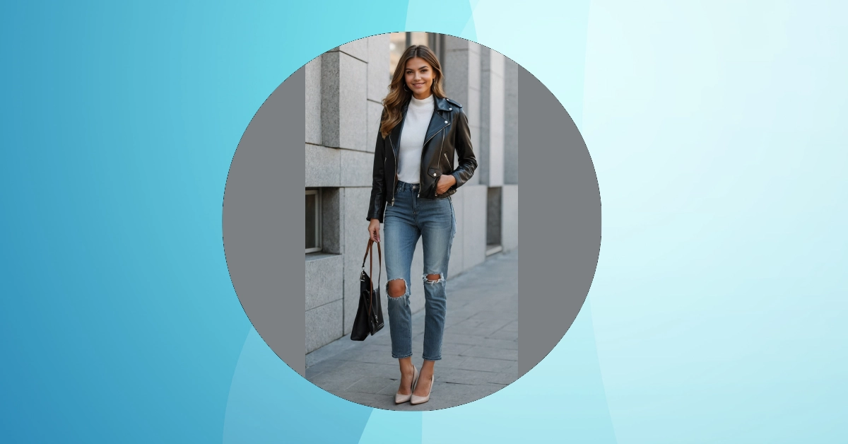 But wait, there’s more to this awesome ‘leather jacket outfit’ than just the jacket! Check out those ripped jeans – they’re like saying, “Yes, I know my knees are showing, and yes, it’s totally on purpose.” And who pairs trendy ripped jeans with fancy heels? Someone who knows how to bend the rules and look amazing doing it! This whole look is about mixing comfy casual with a touch of “I’m a grown-up, kinda,” making it super friendly and approachable while still looking effortlessly stylish. It’s basically the outfit equivalent of saying, “I’m here to have fun and look good doing it, no biggie!”